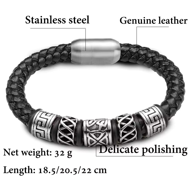 Norse Braided Leather Viking Bracelet - Men's Stainless Steel Rune Jewelry
